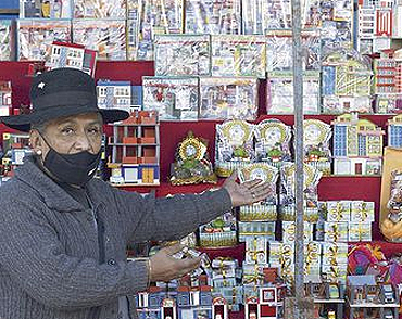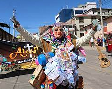 Fiesta de las AlasitasLa Fiesta de la Alasita es una celebración tradicional aymara, cuya característica es la venta de réplicas en miniaturas de bienes anhelados. Dicha transacción se efectúa con la esperanza de obtener, durante el año, los productos adquiridos, para lo cual se los encomienda al Ekeko (Dios de la Abundancia).